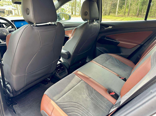 * Pusiau odinis salonas su prabangios rudos spalvos akcentais: komfortas ir elegancija kiekvienam pasivažinėjimui.